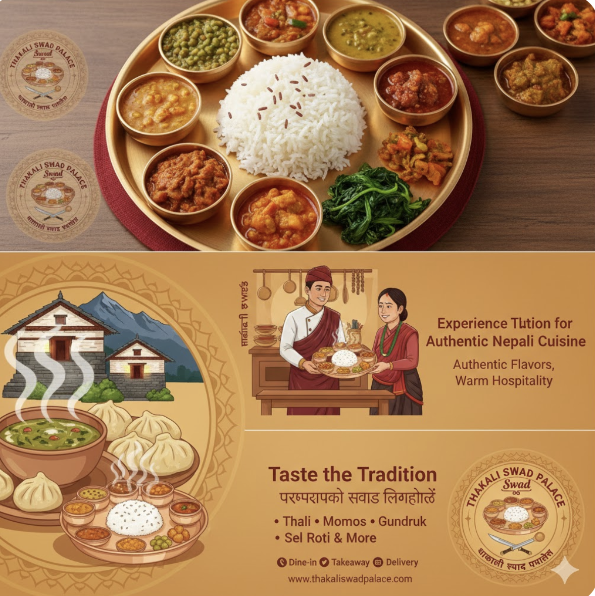 Thakali स्वाद (Swad) Palace is a place where tradition meets taste. Inspired by the rich food culture of the Himalayan region, we bring you the authentic flavors of Thakali cuisine along with a variety of delicious multi-cuisine dishes. At our restaurant, every meal is prepared with fresh ingredients, traditional spices, and a touch of home-style love. From the classic Thakali Khana Set to a wide range of Nepali and international dishes, we aim to satisfy every craving under one roof. We believe food is more than just eating — it’s an experience. That’s why we focus on quality, hygiene, and warm hospitality to make every visit memorable. Whether you're here for a family meal, a casual hangout, or a special occasion, Thakali स्वाद Palace offers a comfortable and welcoming environment for all. ✨ Our Promise Authentic Thakali taste Fresh and hygienic food Friendly service A perfect blend of tradition and modern dining 🍛 Our Speciality “One place, many flavors – from the heart of the Himalayas to your plate.”